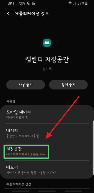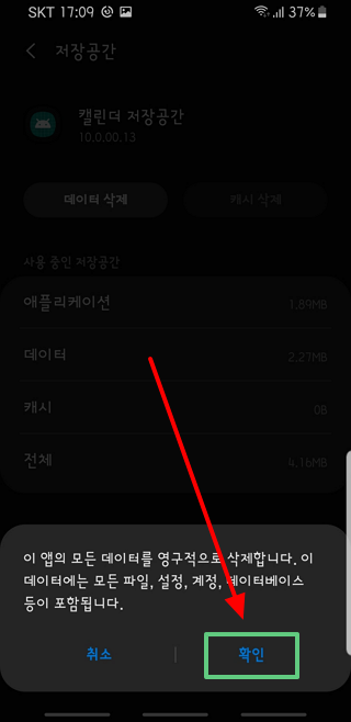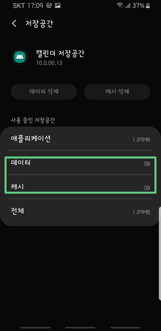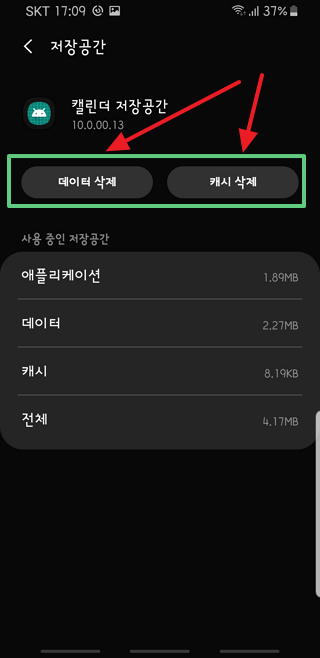 상기와 같이 '캘린더 저장공간' 의 캐시와 데이타를 모두 삭제하고 났더니..