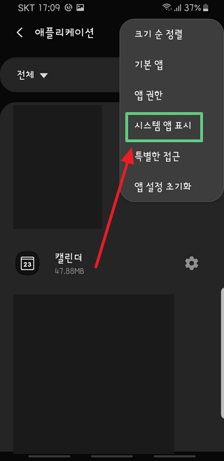 시스템 앱 표시 항목을 터치합니다.