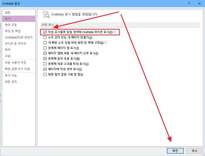 '작업 표시줄의 알림 영역에 OneNote 아이콘 표시' 항목을