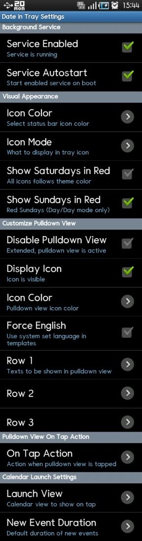 - Background Service 에 나오는 Service Enabled 와 Service Autostart 는 기본적으로 켜 두어야 합니다. 알림창에 일자가 항상 보여야 한다면 말입니다.