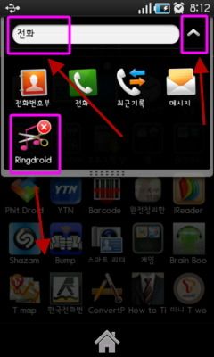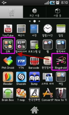 아래 왼쪽 이미지와 같이 'Ringdroid' 어플을 '전화' 폴더에 넣을 겁니다.