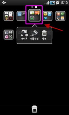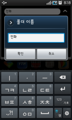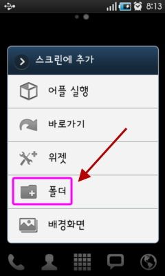 바탕화면(스크린)에서 어플을 하나 잡아서 다른 어플 위에 던져 놓으면 둘이 폴더에 같이 들어가는 그런거요.