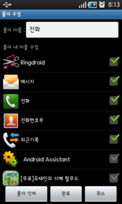 여기서 '폴더 삭제' 를 터치하더라도 폴더만 삭제되고 폴더에 들어 있는 어플은 삭제되지 않습니다. ^^.