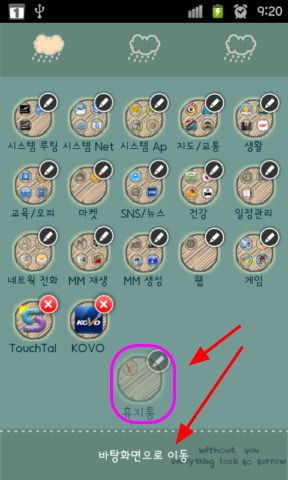 안드로이드 기본 런처의 하단은 '삭제' 용도로 쓰이던 것이라 이쪽에서 바로 터치를 풀어 버리게 되면,